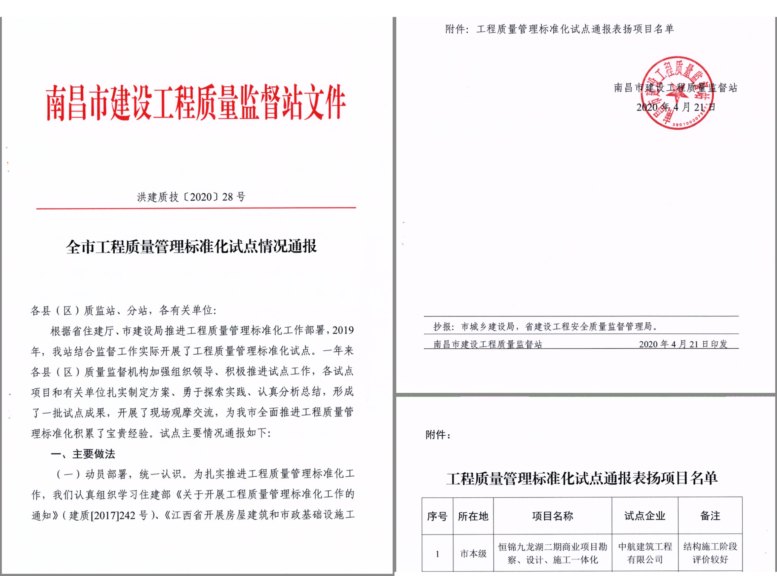 恒錦九龍湖二期商業(yè)項(xiàng)目繼承辦南昌市市級觀摩工地后再創(chuàng)佳績! 獲得南昌市工程質(zhì)量管理標(biāo)準(zhǔn)化試點(diǎn)通報表揚(yáng)。