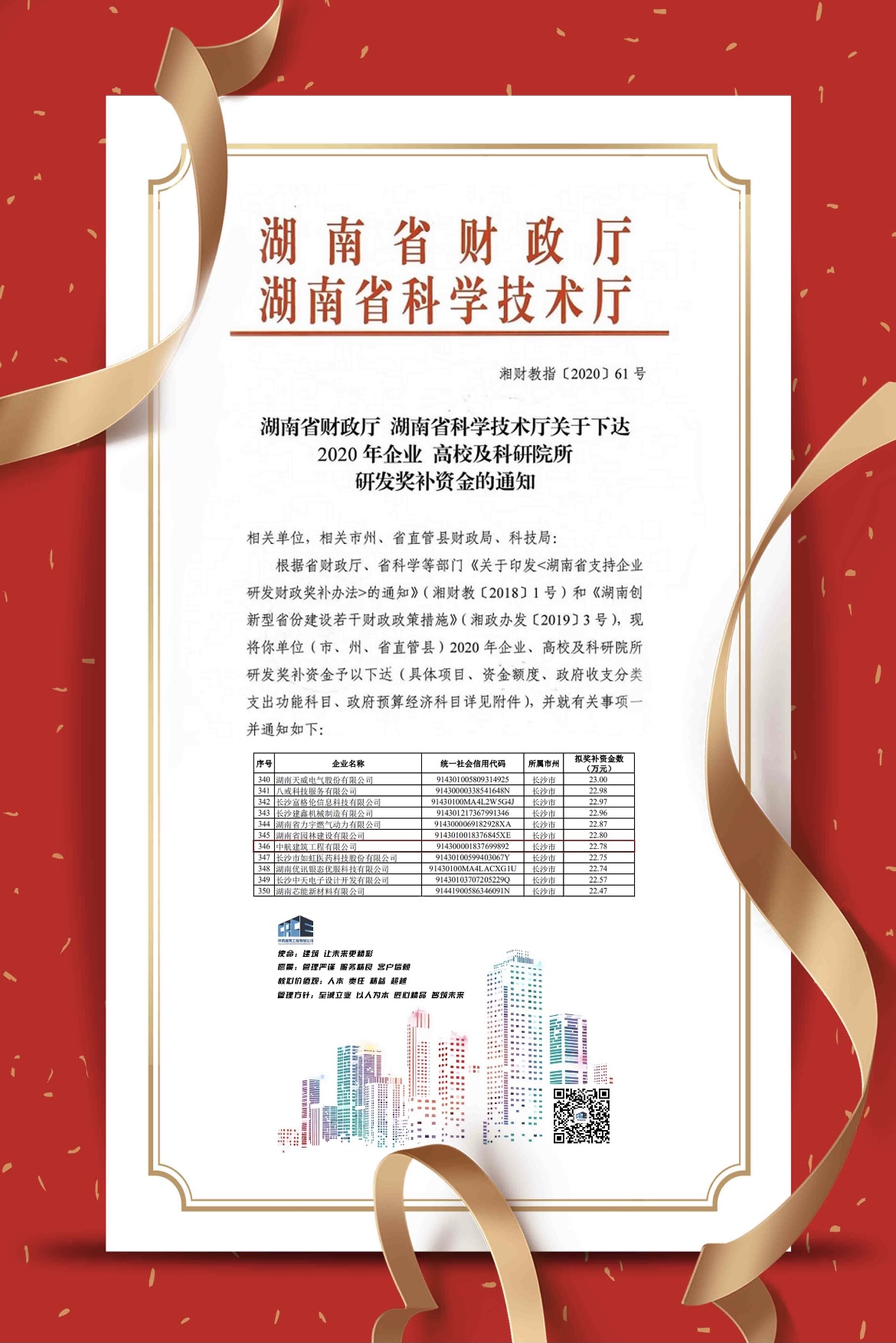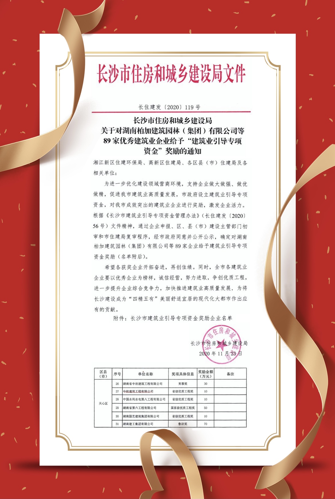 根據(jù)《湖南省財(cái)政廳、科學(xué)技術(shù)廳關(guān)于下達(dá)2020年企業(yè)、高校及科研院所研發(fā)獎(jiǎng)補(bǔ)資金的通知》及《長(zhǎng)沙市住房和城鄉(xiāng)建設(shè)局“關(guān)于對(duì)89家建筑業(yè)企業(yè)給予建筑業(yè)引導(dǎo)專項(xiàng)資金”獎(jiǎng)勵(lì)的通知》(長(zhǎng)住建發(fā)【2020】119號(hào)文件)精神,我司喜獲“研發(fā)獎(jiǎng)補(bǔ)資金22.78萬(wàn)元”和優(yōu)秀建筑業(yè)企業(yè)“建筑業(yè)引導(dǎo)專項(xiàng)資金10萬(wàn)元”,這標(biāo)志著各級(jí)行政主管部門對(duì)我司在行業(yè)內(nèi)領(lǐng)先的施工技術(shù)和先進(jìn)管理水平的高度認(rèn)可。