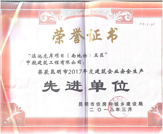 2018年04月03日,昆明市住房和城鄉(xiāng)建設(shè)局組織召開(kāi)昆明市2017年度建設(shè)工程質(zhì)量管理、安全生產(chǎn)、文明施工及揚(yáng)塵治理管控總結(jié)暨2018年工作部署會(huì)議。我司通過(guò)承建昆明滇池龍岸五區(qū)項(xiàng)目獲得《昆明市2017年建筑企業(yè)安全生產(chǎn)先進(jìn)單位》稱(chēng)號(hào)。